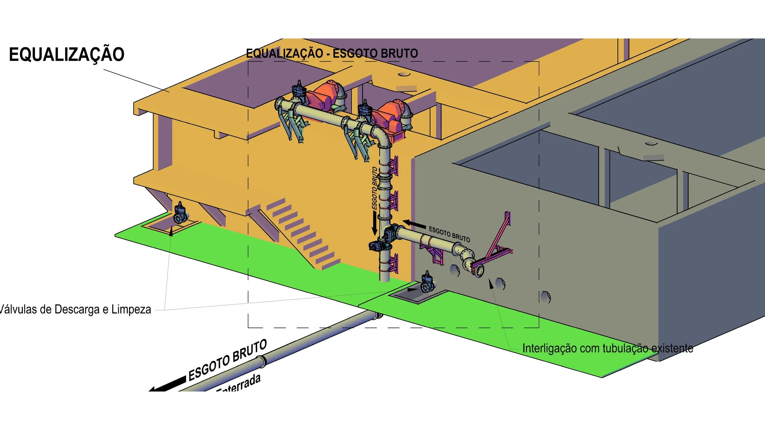 Designed, produced the full technical package, and supervised structural modifications and piping installation for a 130 L/s wastewater treatment station (WWTS) module—Module II. The scope included adapting the concrete structure, installing a new piping layout, and integrating new pumps and valves to resolve persistent clogging observed in Module I, while maintaining continuity of operations.