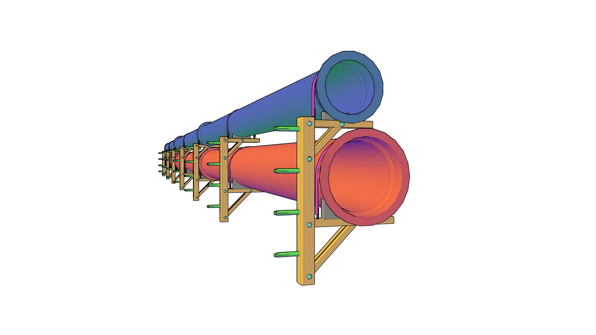Designed, produced the full technical package, and supervised installation of bridge-mounted supports on a ~110 m span to carry an existing water main and a new rising main conveying most of the city’s sewage to the WWTP. Scope included support design and detailing, load checks on the bridge elements, constructability planning, and staged works to keep services operating.